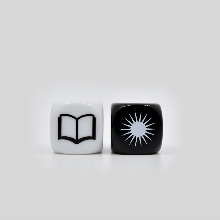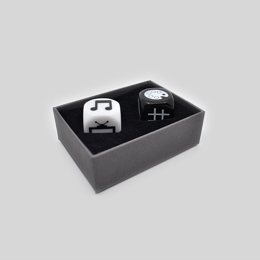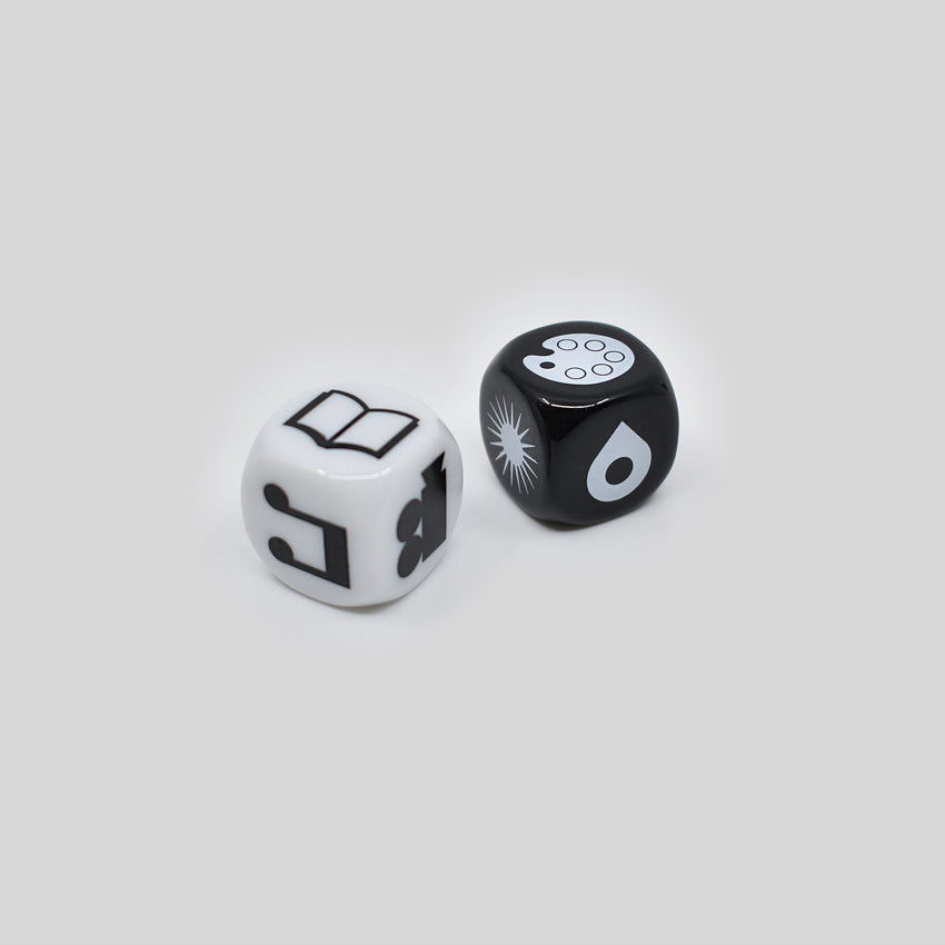 The game consists of two dice. The white dice sets the category (film, book, TV, band, game, song) and the black dice sets the theme (colour, animal, food, weather, place, number).