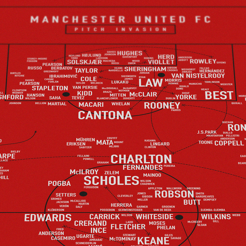 Featuring club legends: Edwards, Law, Best and Charlton. Old Trafford heroes: Robson, Cantona, Keane, Beckham and Rooney and fan favourites: Solskjær, Cole, Neville, O’Shea and Diallo and more recent signings Højlund and Yoro.